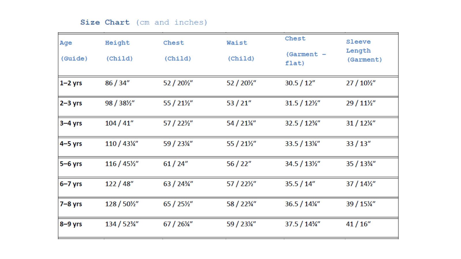 • Measurements provided in both centimetres (cm) and inches